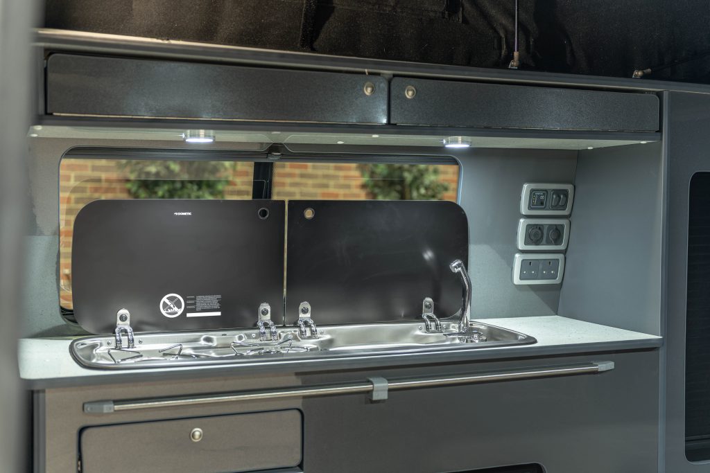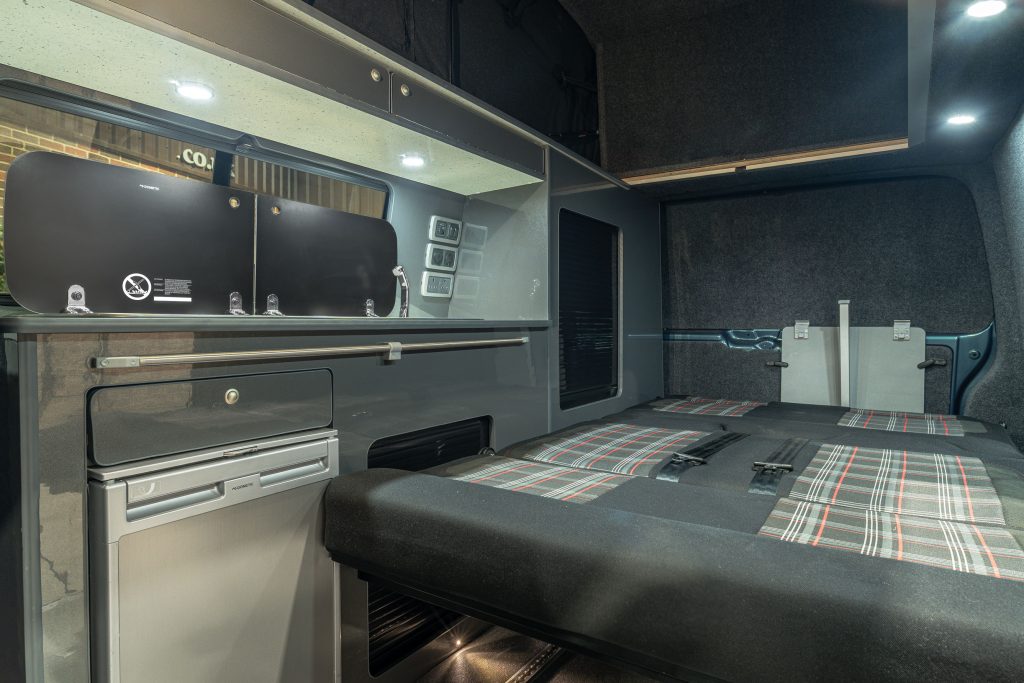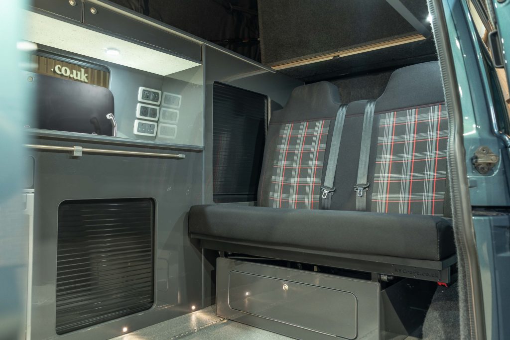 Externally, this camper looks amazing with a sports front bumper, colour coded rear spoiler, black side bars and awning multi rail fitted. The rare Bamboo Green paintwork is set off with a set of immaculate 20” Gloss Grey Riviera Multi spoke Alloy wheels and sits on brand New JOM Coilover suspension.