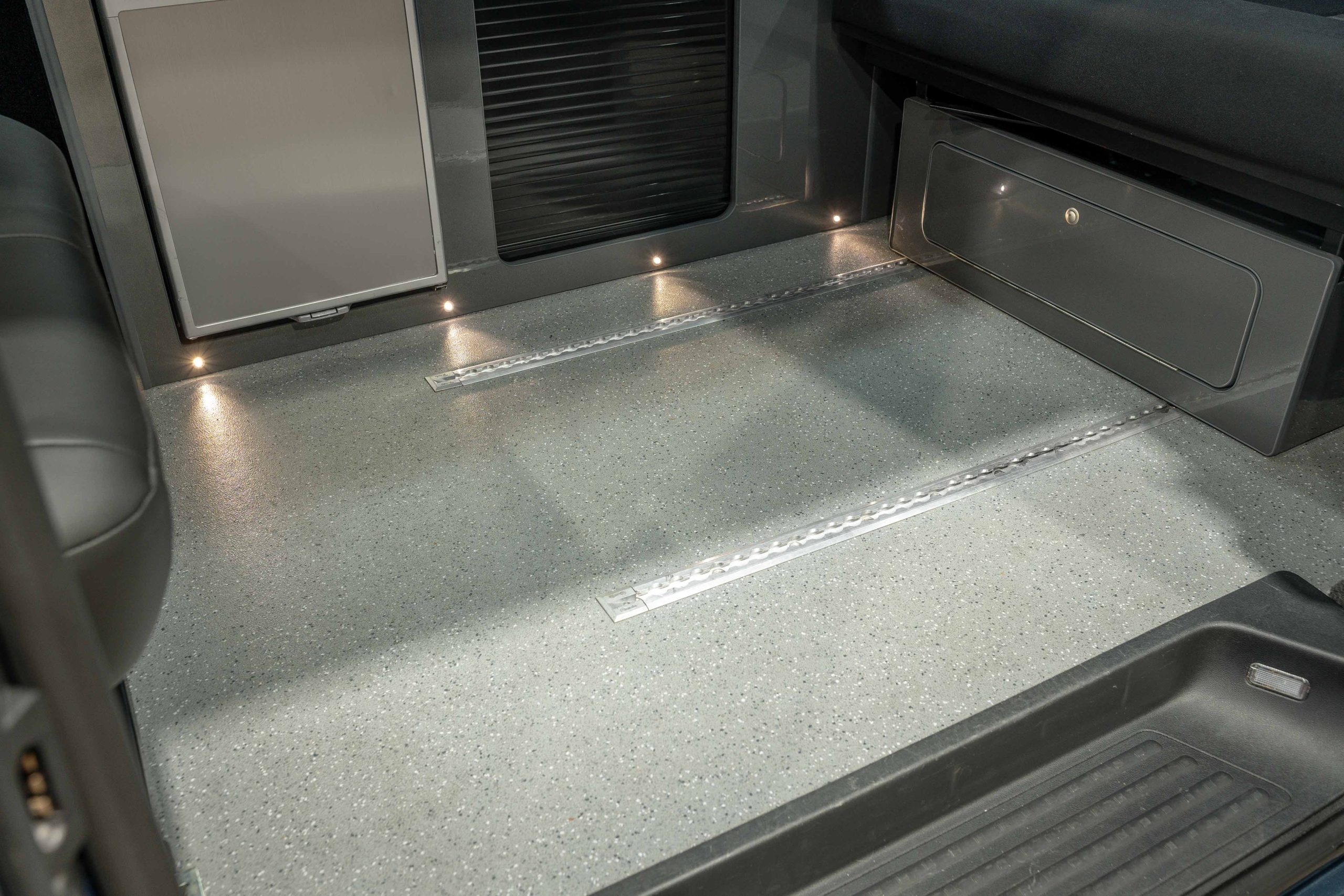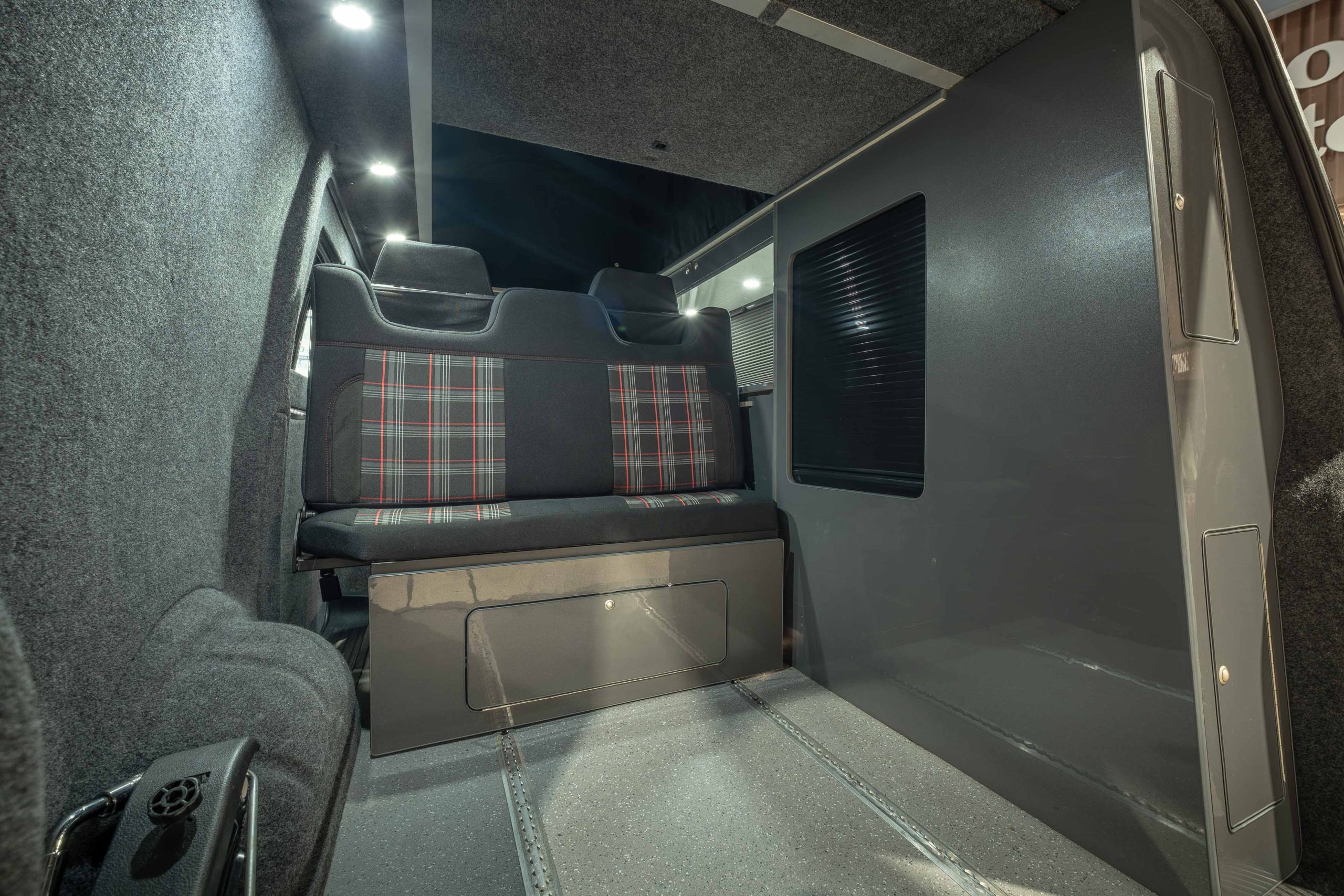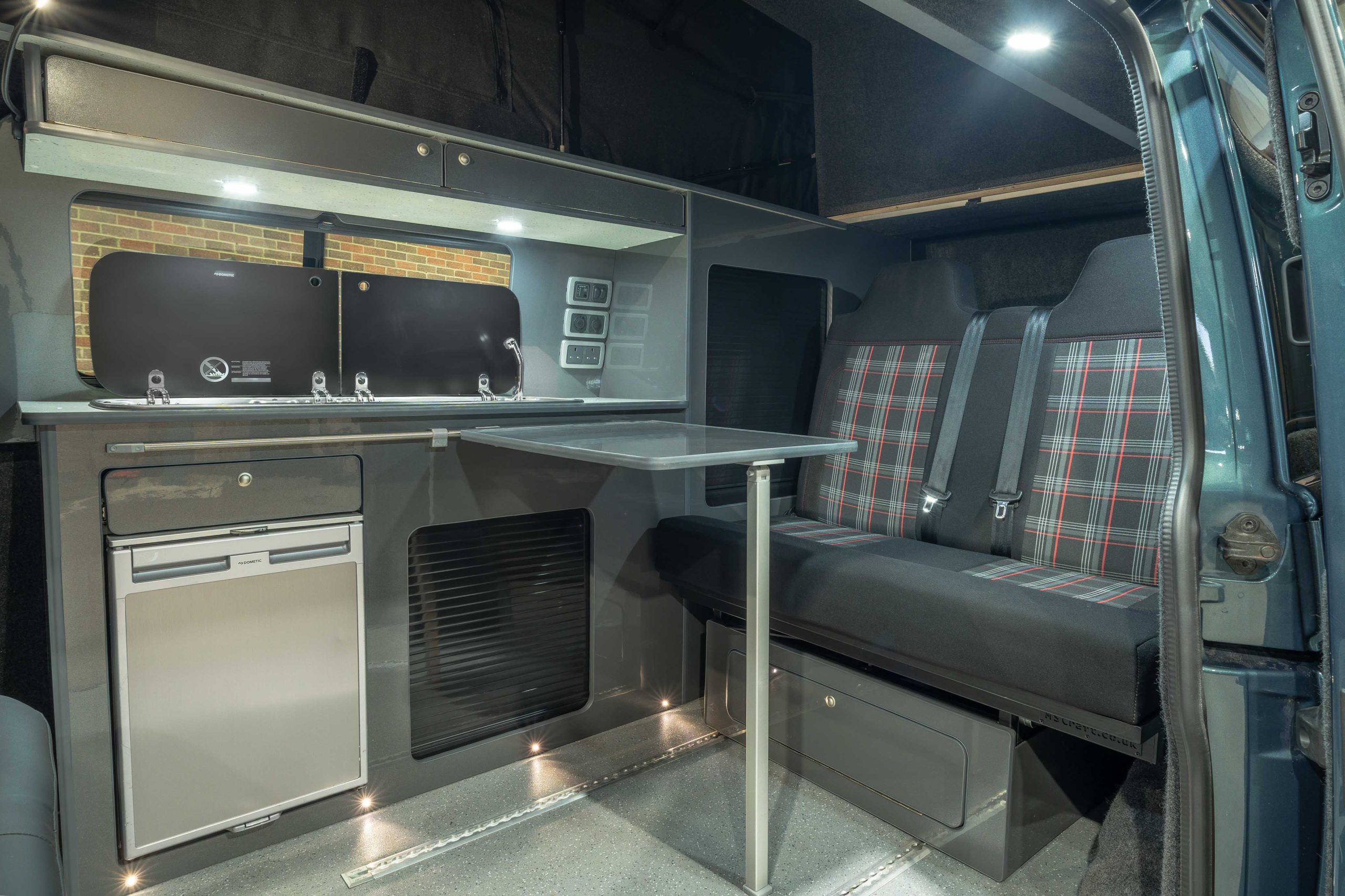 Externally, this camper looks amazing with a sports front bumper, colour coded rear spoiler, black side bars and awning multi rail fitted. The rare Bamboo Green paintwork is set off with a set of immaculate 20” Gloss Grey Riviera Multi spoke Alloy wheels and sits on brand New JOM Coilover suspension.