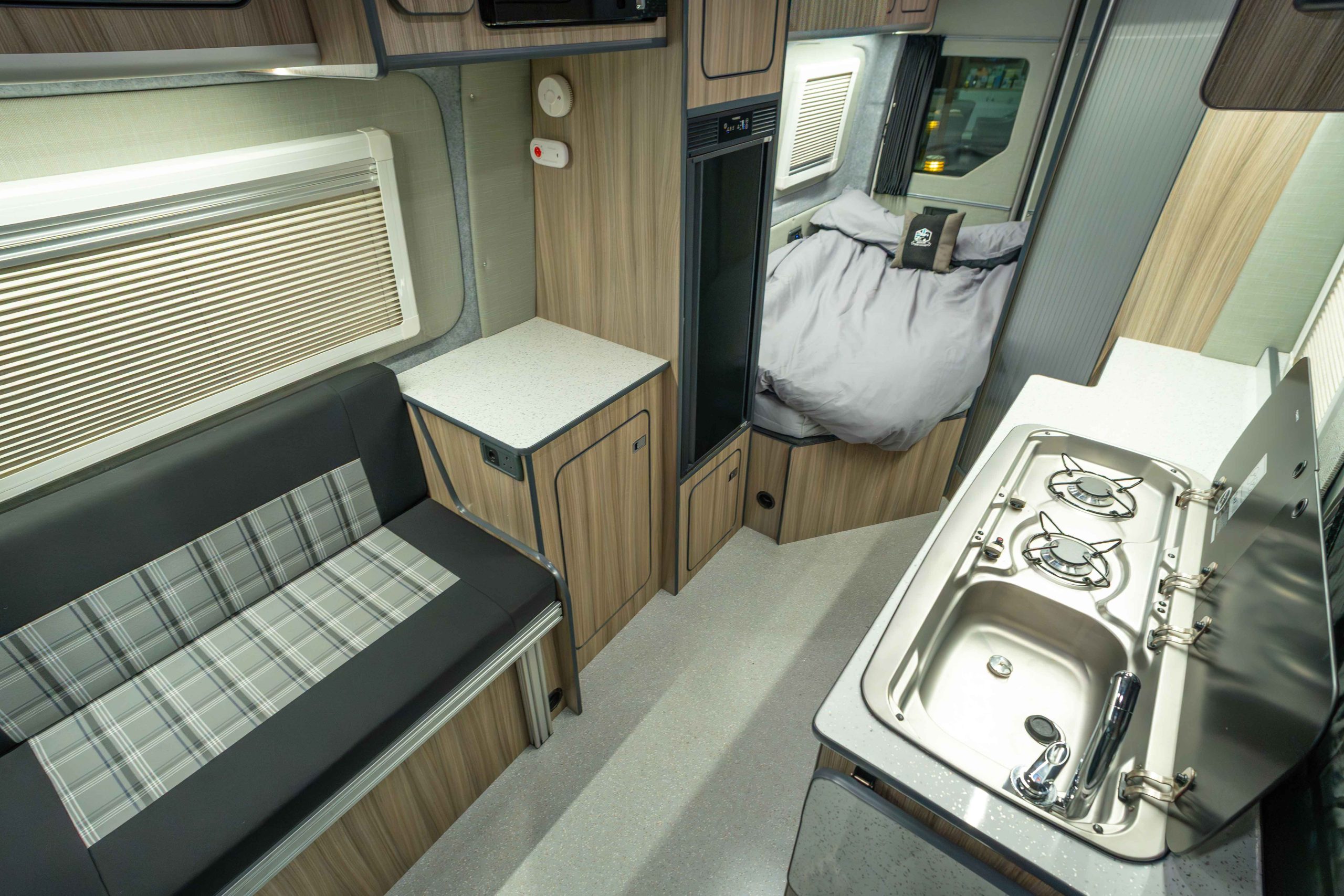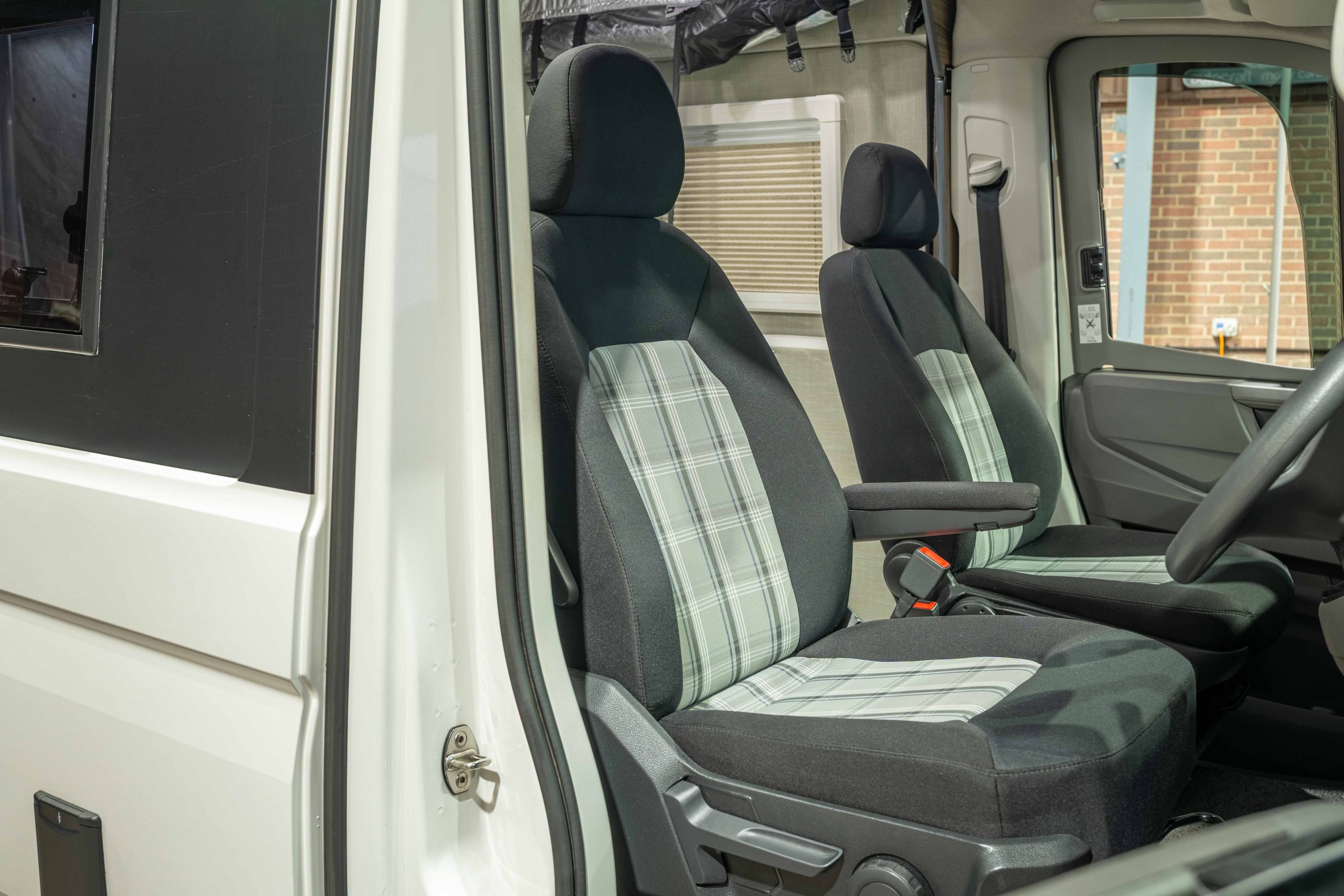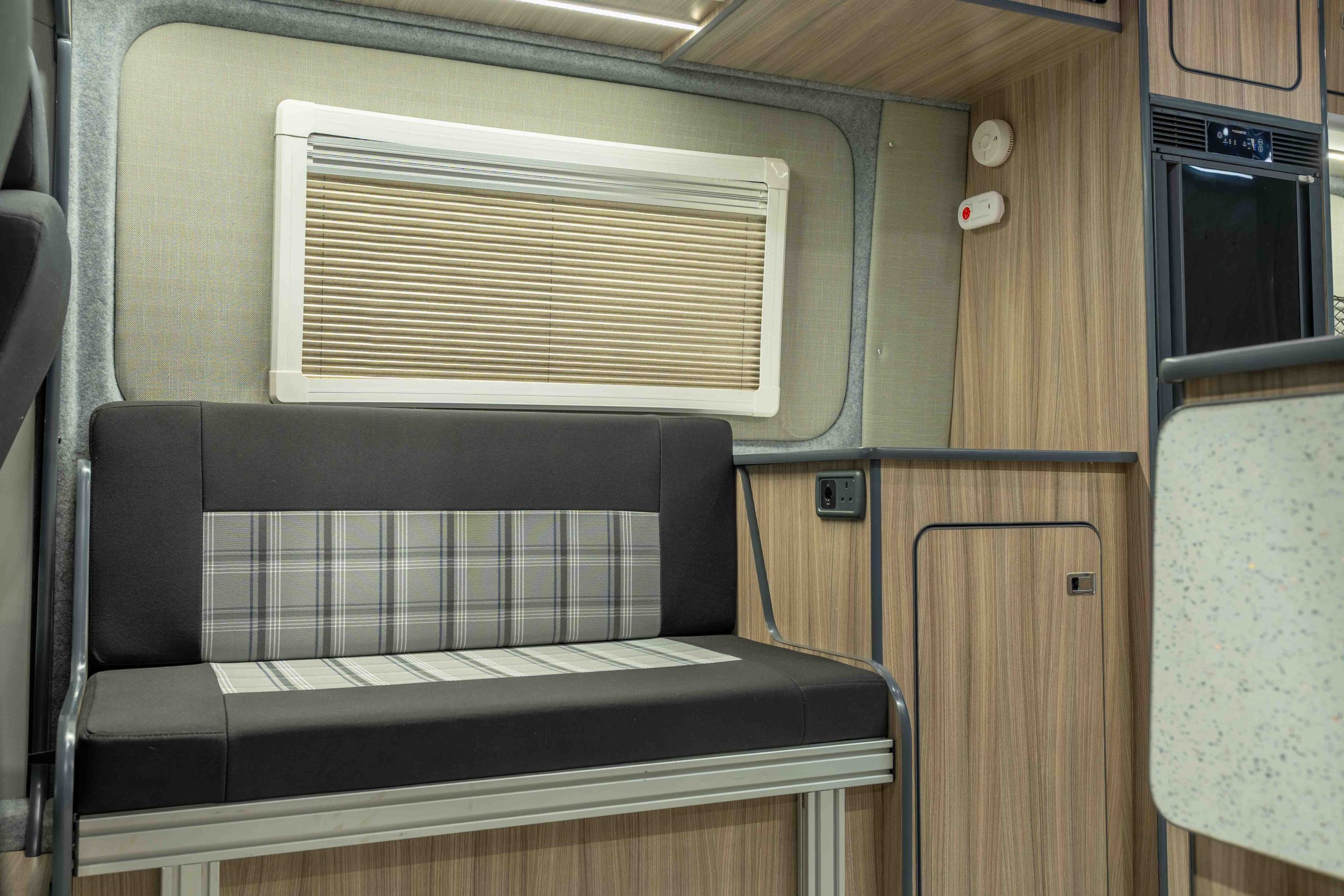 In the cab area, the passenger seat is on a swivel base and all seating is upholstered in light grey check fabric with black side bolsters and headrests including the bench seat behind the driver which also pulls out into a small bed! The media system features DAB radio and Apple Carplay/Android Auto when connected via the built-in USB port.