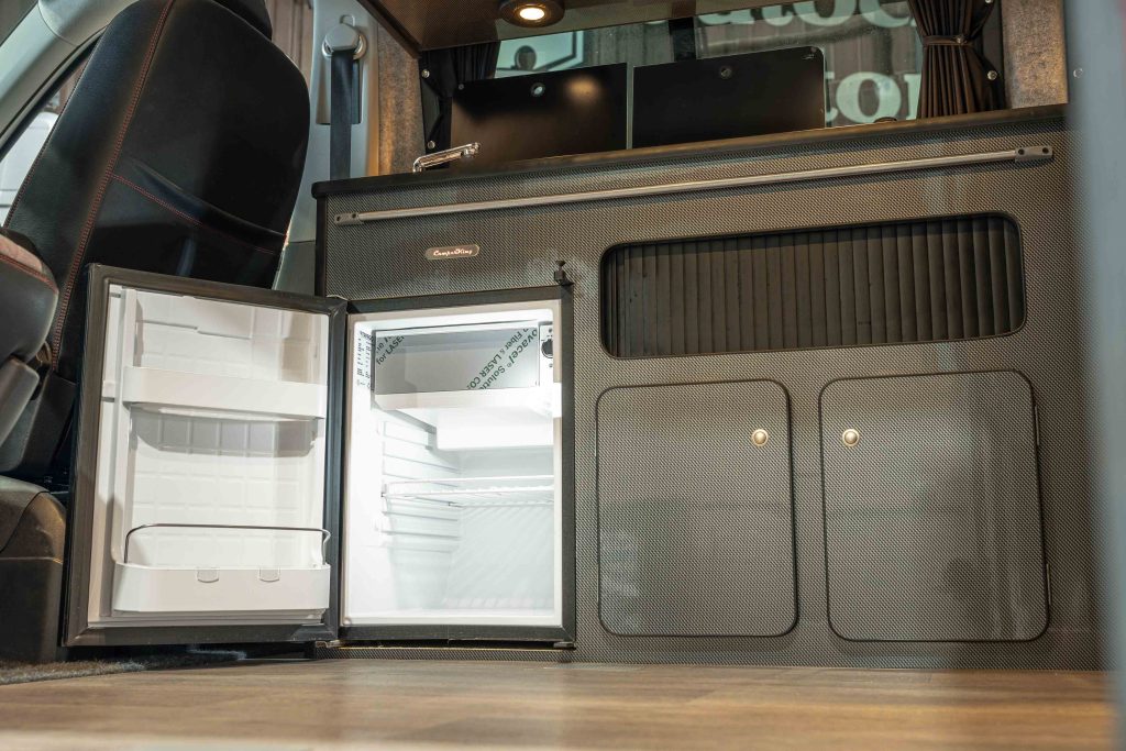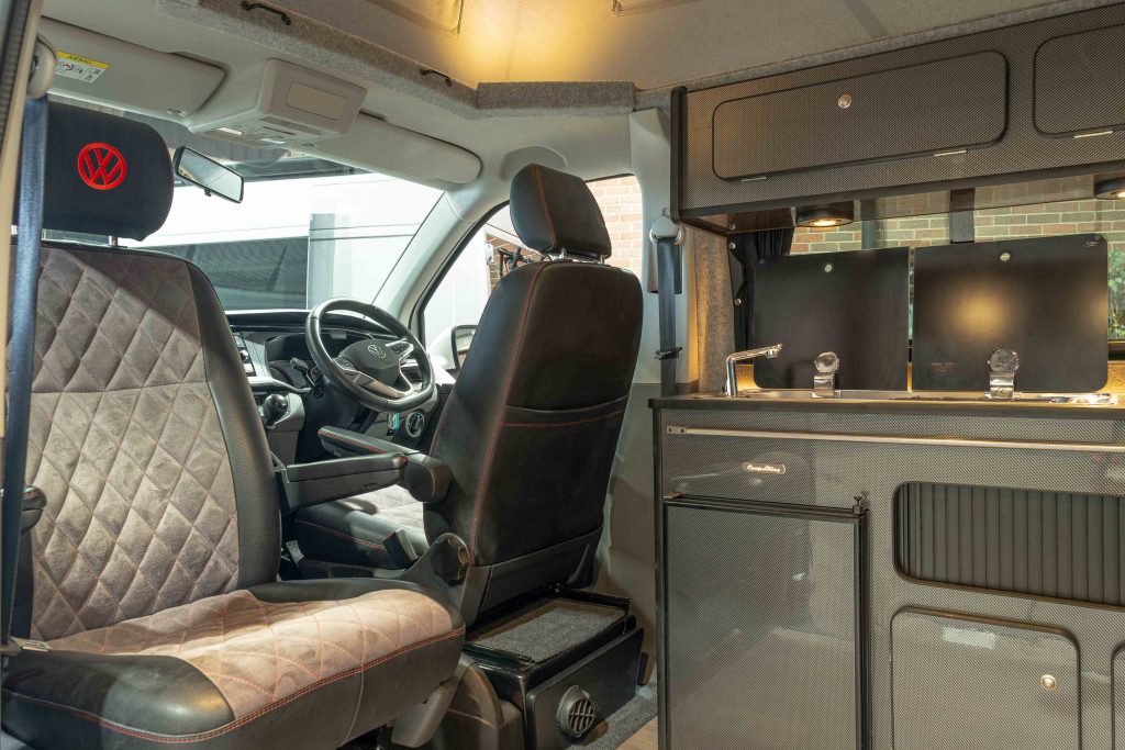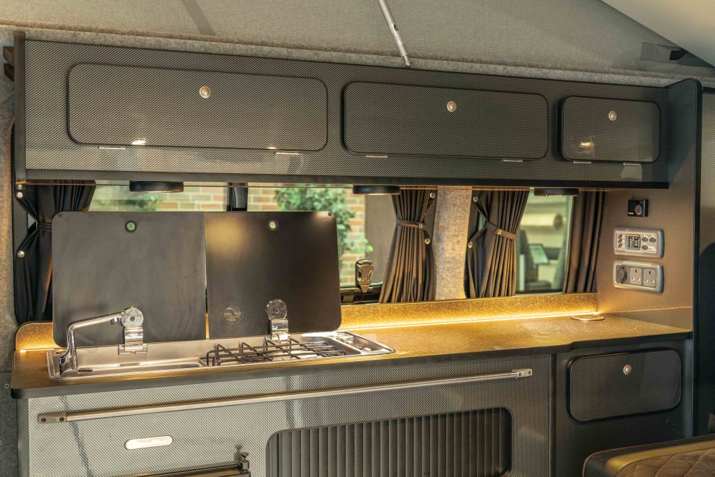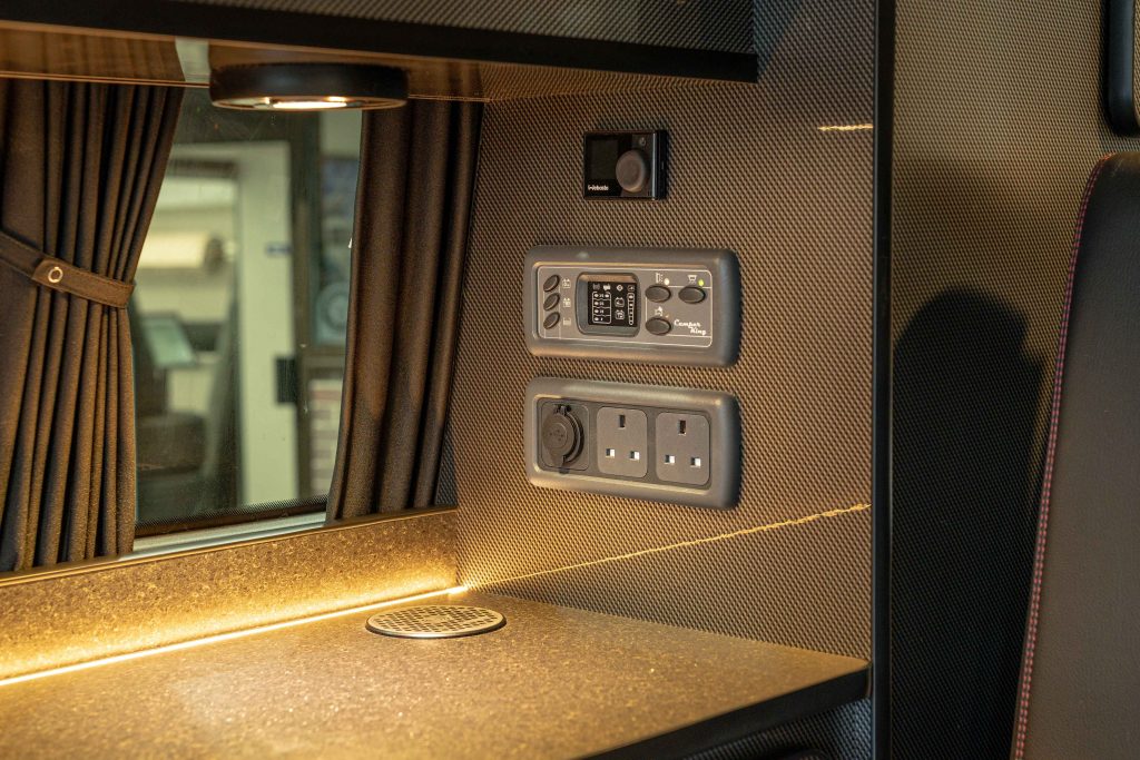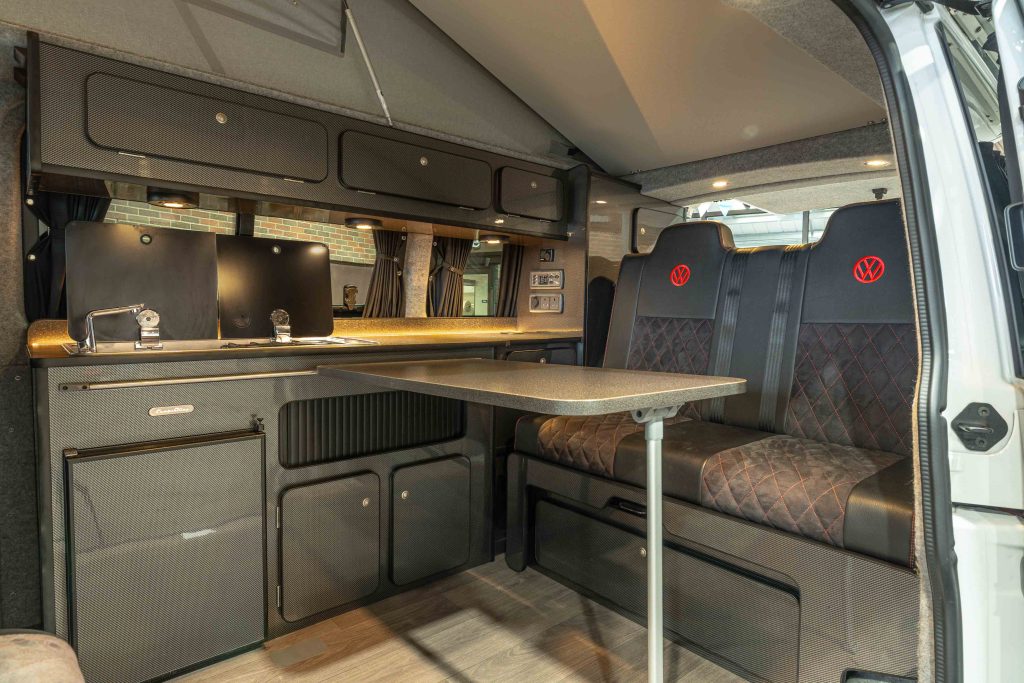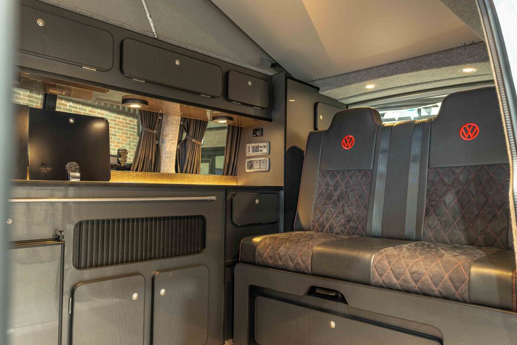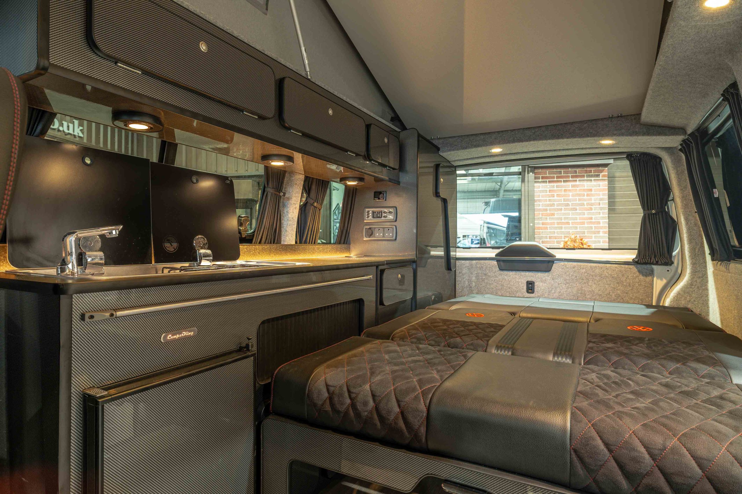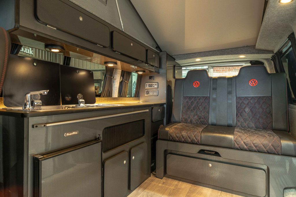 Contrasting against the paintwork are 20” Gloss Black VW ‘Peeler’ style Alloy wheels. Inside, the kitchen units are finished in Carbon fibre effect lightweight ply with grey granite effect worktop and tables along with usual refinements of sink/hob unit, fridge freezer and LED lighting throughout.