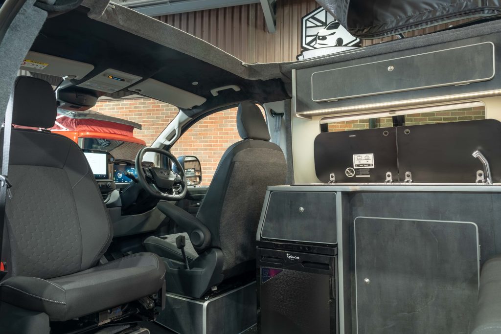 Brand New and just converted is this stunning 2025 Ford Transit Custom Limited Campervan finished in Chrome Blue Metallic Paintwork. Professionally converted by our team with Slate Grey lightweight cabinetry and Willow Green worktop, splashback and matching tables. The front single passenger seat is fitted to a swivel base, and the versatile RIB bed has upholstered to match the original Ford Pin Hex pattern fabric on the front seats to maintain the OE look.