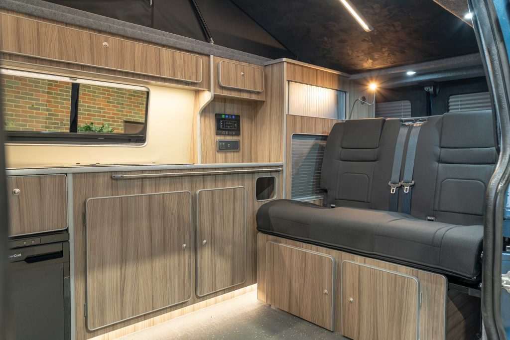 This great looking campervan is based on the versatile LWB version of the Ford Transit Custom Limited and comes with the rare and desired Automatic gearbox. Built to the highest standards, the interior cabinetry is finished in Driftwood lightweight furniture board, with Willow Green worktop, Splashback and matching tables. Presented in metallic Blue with contrasting 18” gloss black alloy wheels and solar panel this camper is ready to get you out on the road in style and comfort.