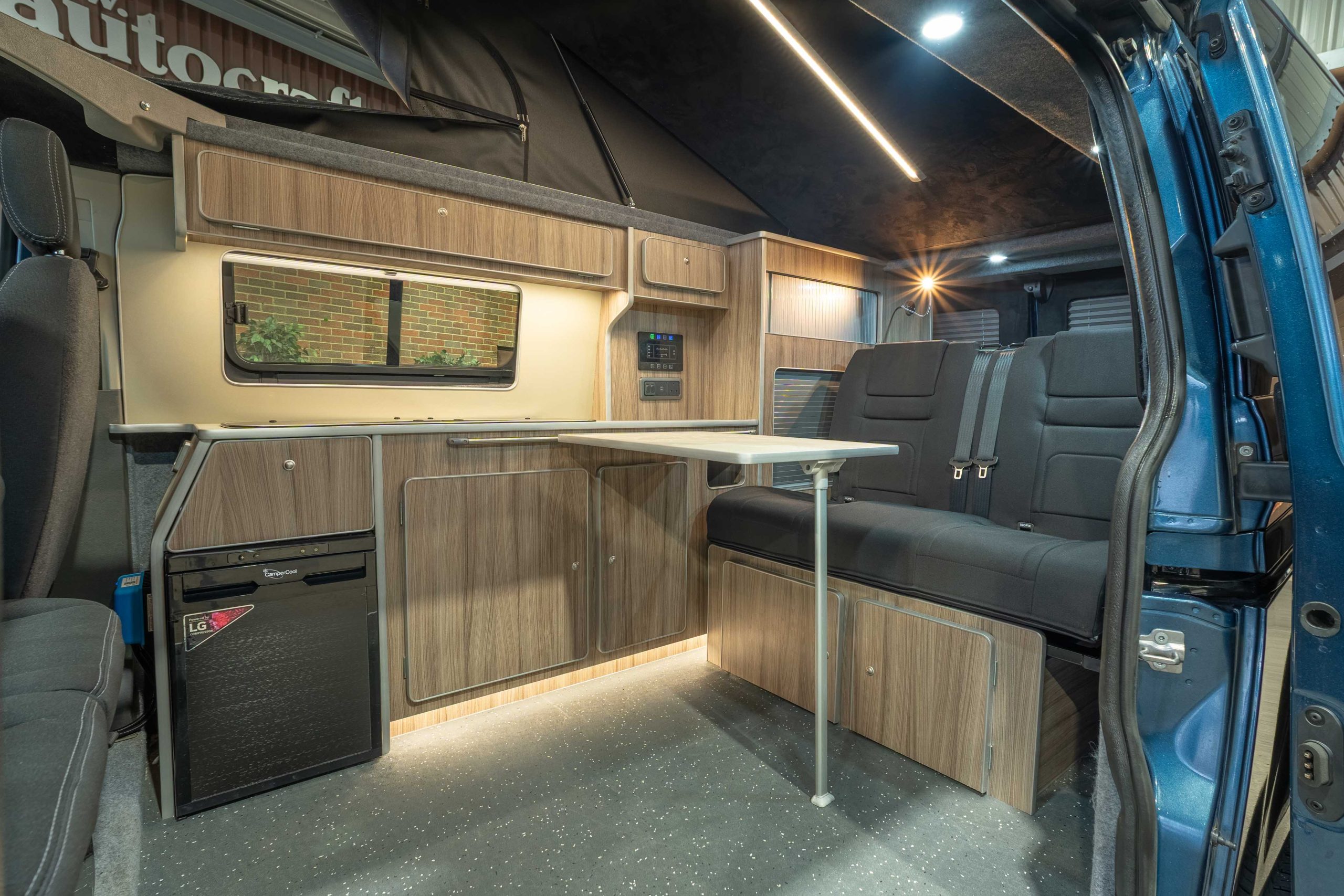 This great looking campervan is based on the versatile LWB version of the Ford Transit Custom Limited and comes with the rare and desired Automatic gearbox. Built to the highest standards, the interior cabinetry is finished in Driftwood lightweight furniture board, with Willow Green worktop, Splashback and matching tables. Presented in metallic Blue with contrasting 18” gloss black alloy wheels and solar panel this camper is ready to get you out on the road in style and comfort.