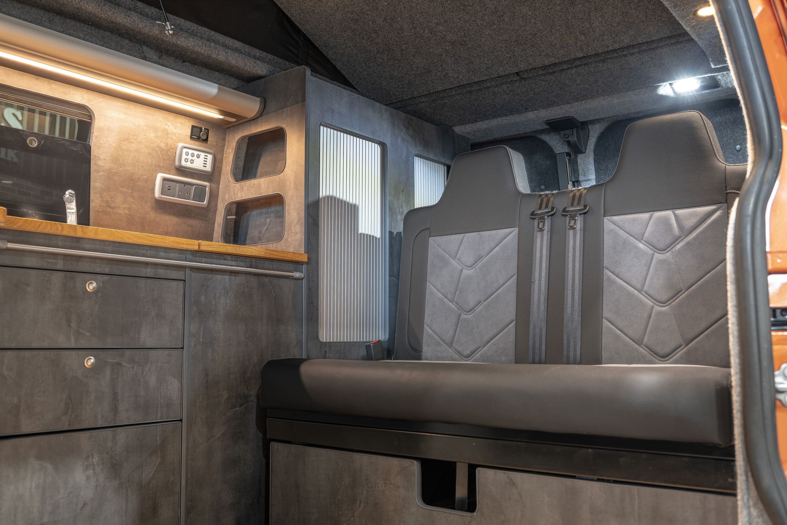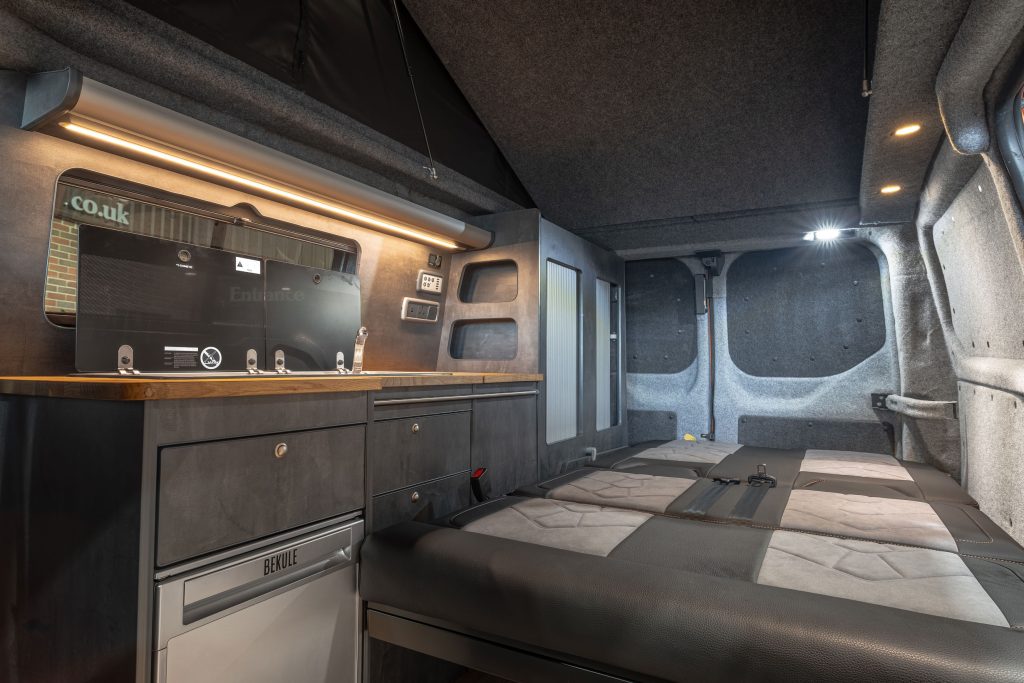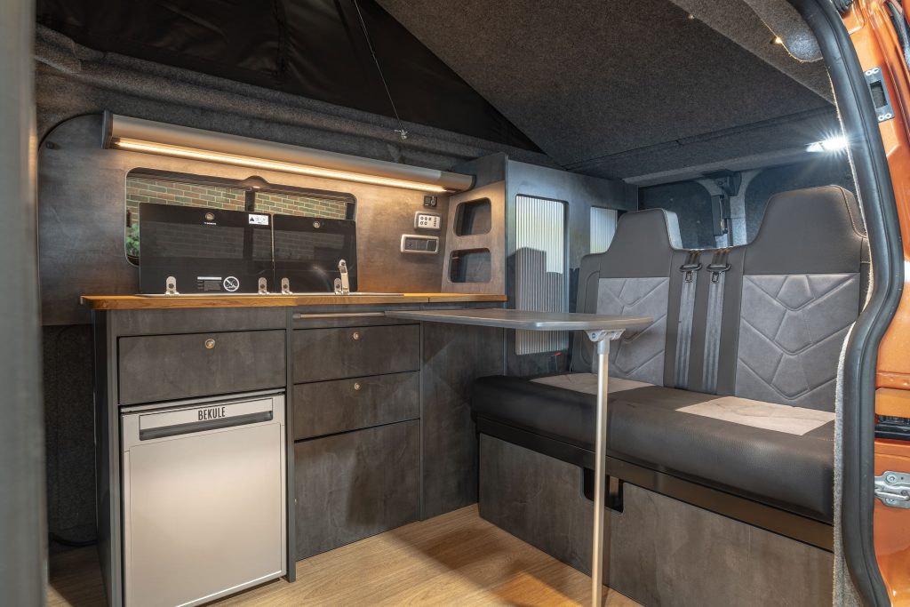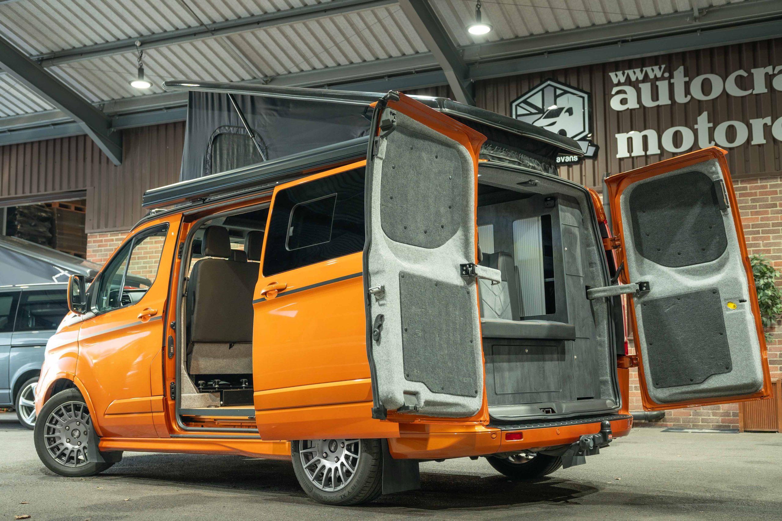 Now in stock here Autocraft Motor Caravans is this stunning 2018 Ford Transit Custom Sport in Orange Glow, professionally converted and is a one off and stands out from the rest – finished in Slate Grey ply with Real Oak worktop, with rock n roll bed with under bed storage, Sargent power management system and elevating roof with upper bed board creates this 4 berth campervan perfect for the family trips and daily driving alike.