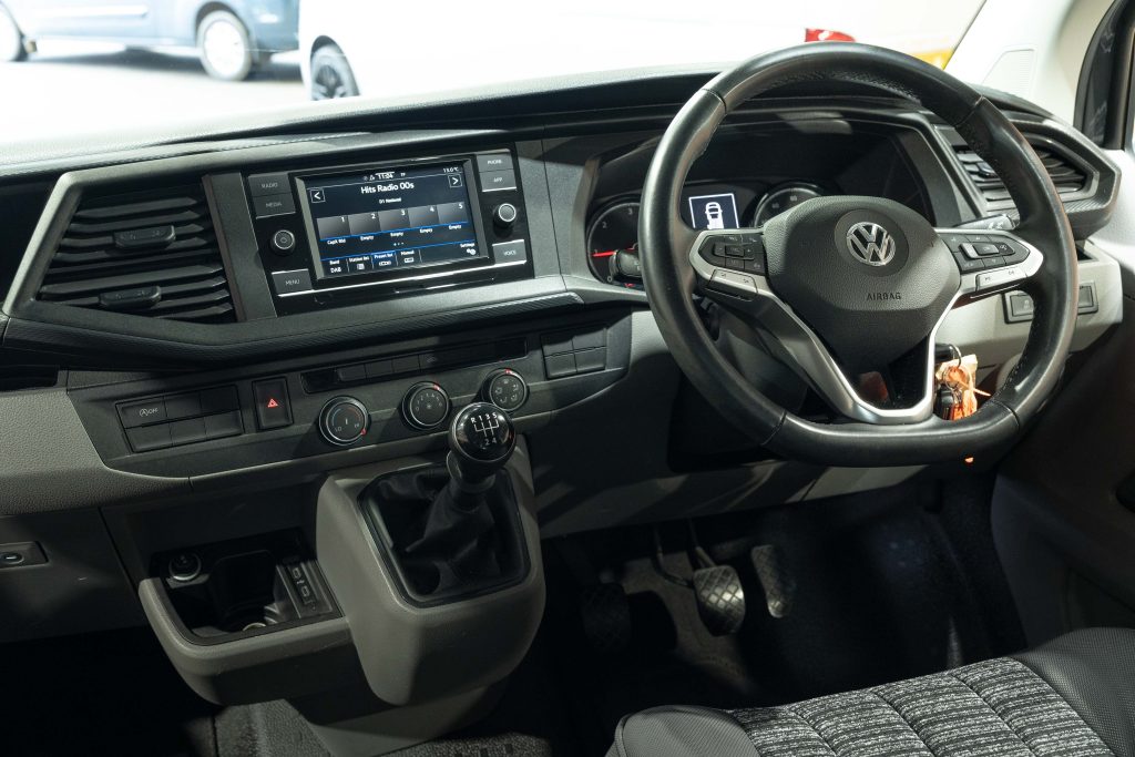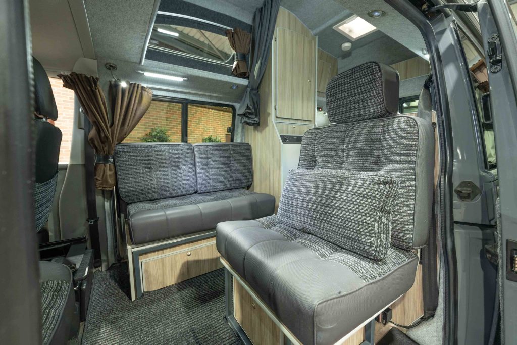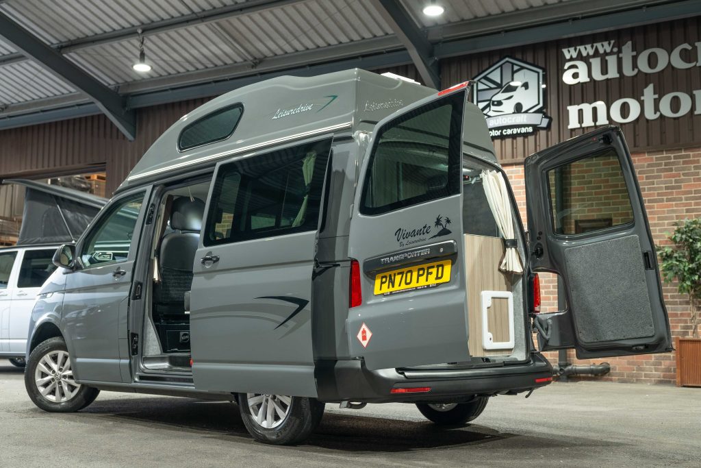 Just arrived into stock is this versatile 2020 Pure Grey Leisuredrive Vivante VW Transporter T6.1 Campervan. Professionally converted with Driftwood Lightweight cabinets and contrasting Silver worktop. Up front are two single seats with a single rear seat behind the passenger and a bench seat behind the driver. This combination allows for two single beds or a double for ultimate sleeping flexibility.