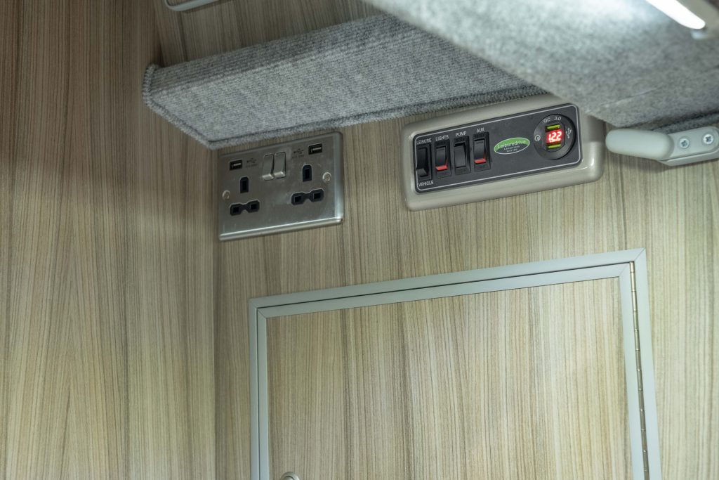 Externally, it is finished in Pure Grey with 16” alloy wheels, windows in the high roof for additional light and an external 240v hook up for mains power when on site.