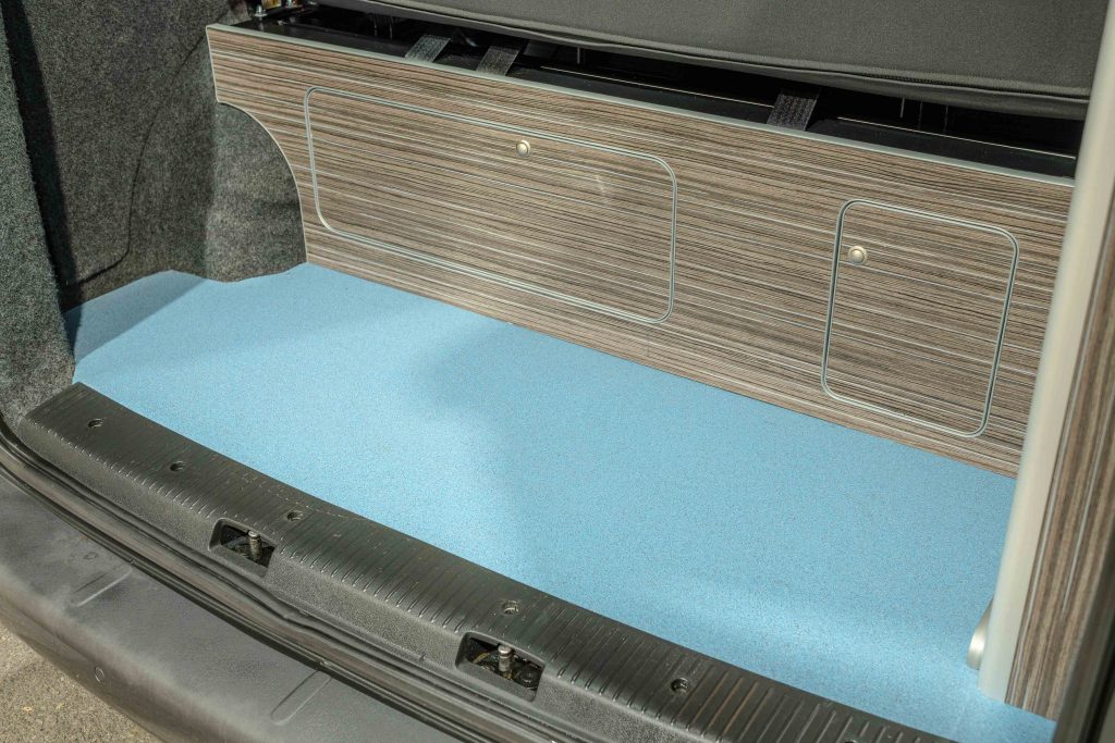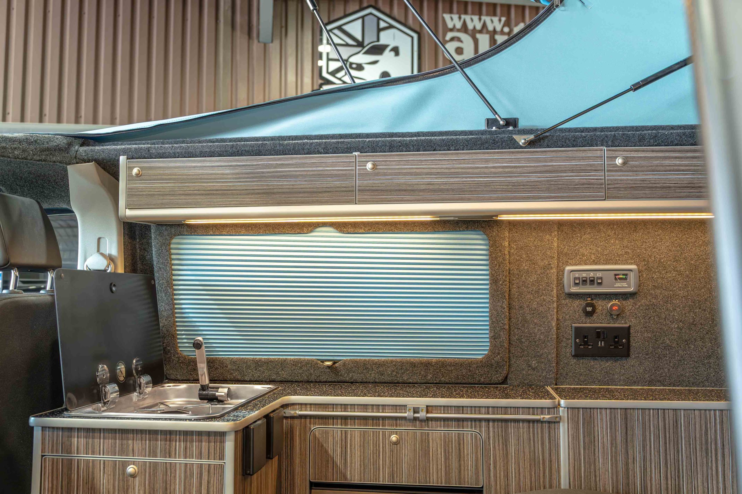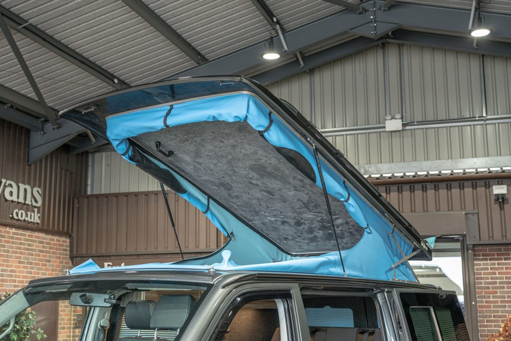 This camper sits on 18” Gloss Black Alloy wheels and has the front grille trim and pop-top canvas colour coded in contrasting blue, making this camper stand out from the rest.