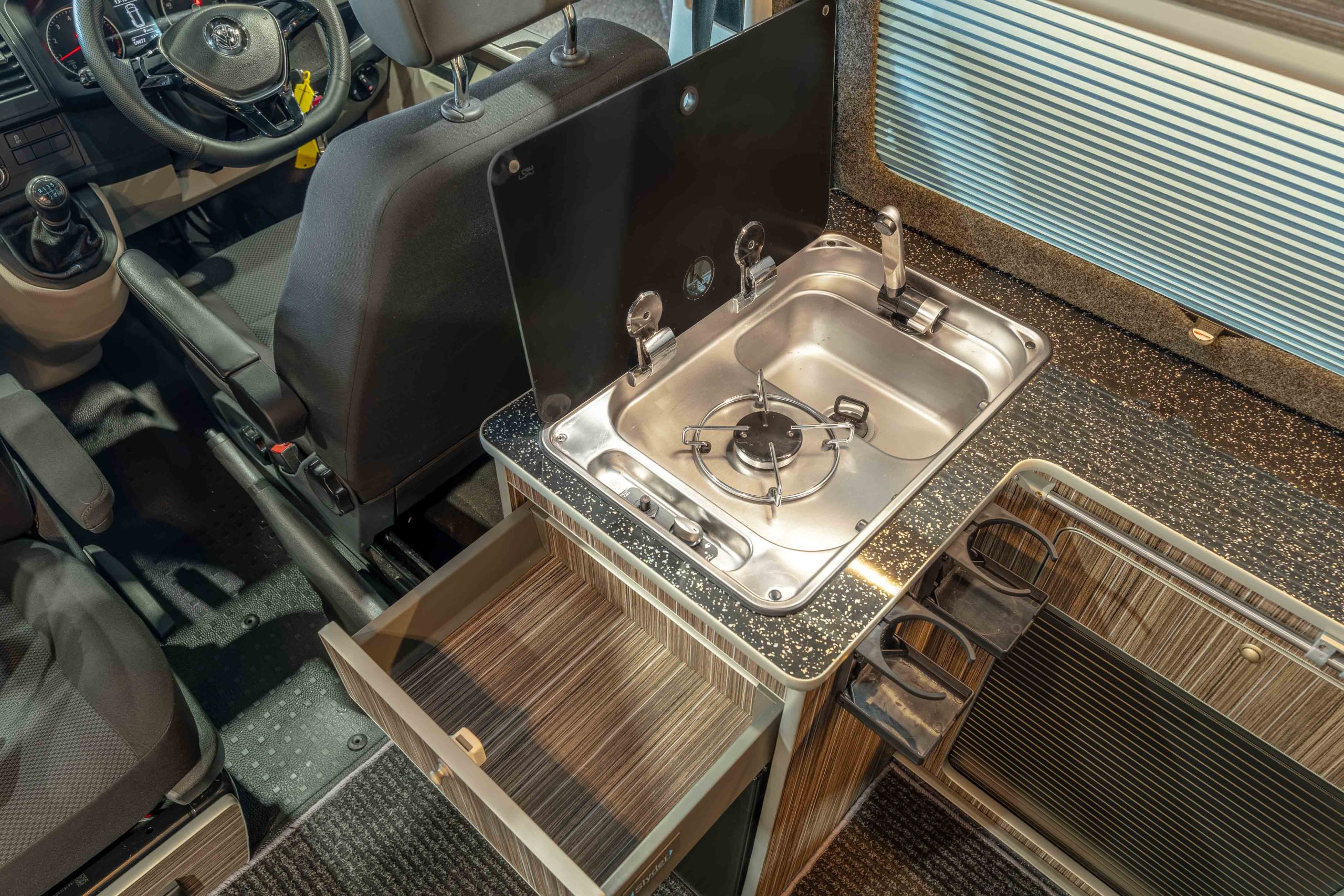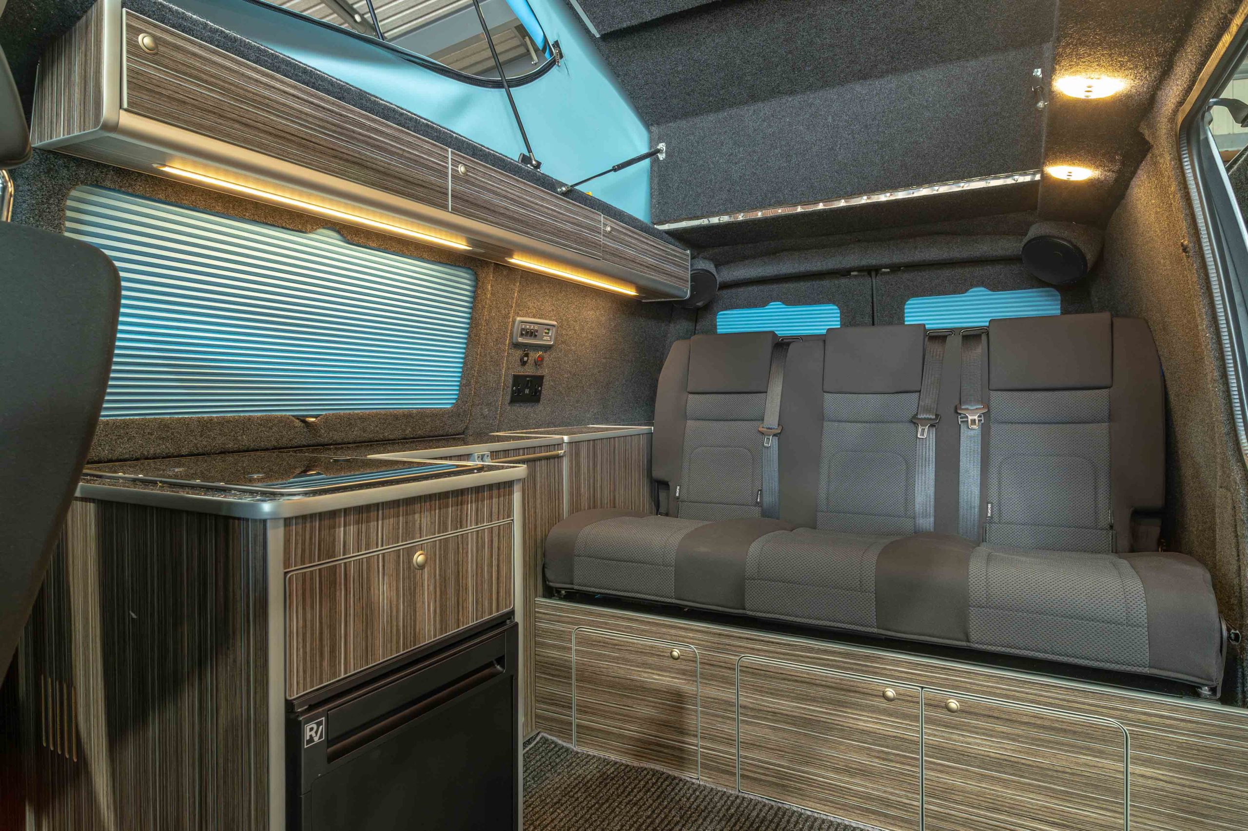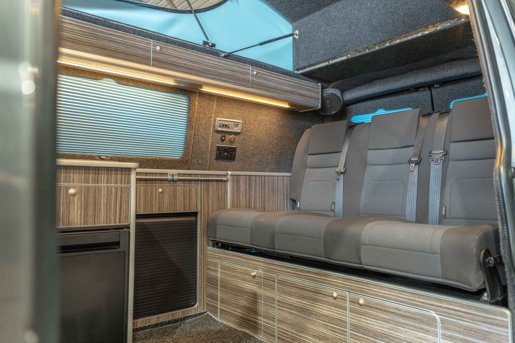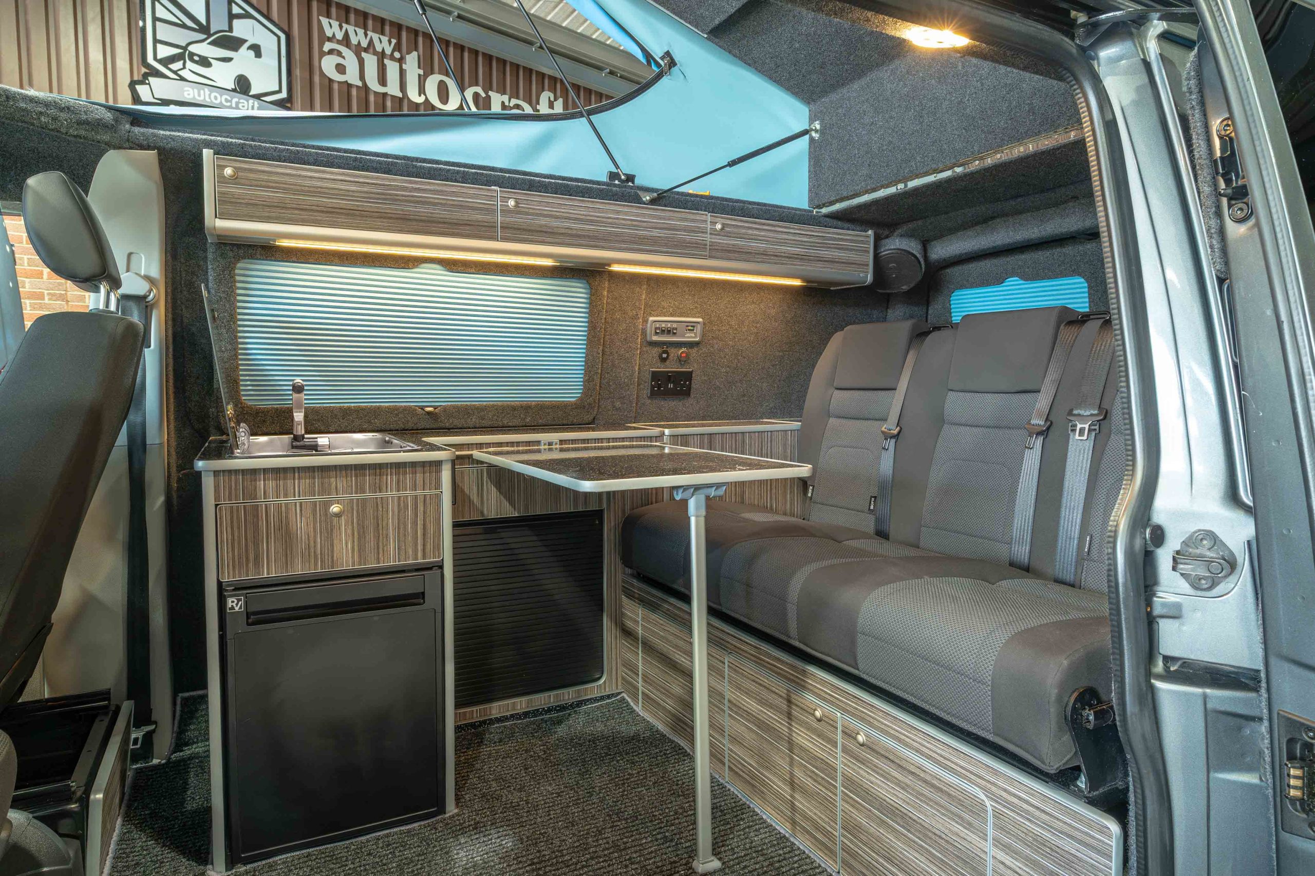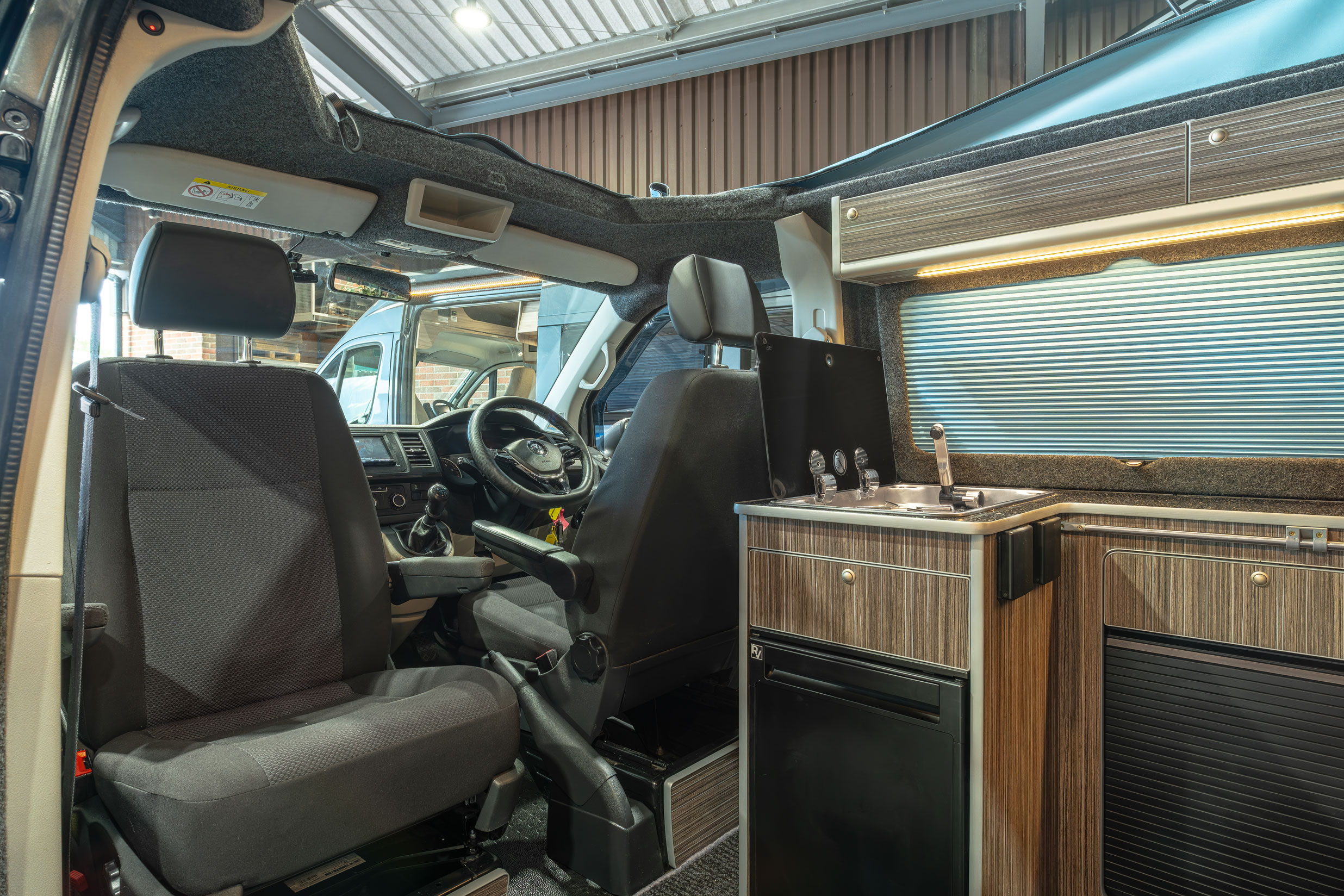 Just arrived into stock is this sports styled 2019 Metallic Grey VW Transporter T6 Campervan. This camper has been professionally converted and features a 50l fridge freezer, single gas hob and sink, three seater RIB bed with Isofix and two captains seats at the front finished to match the original VW upholstery.
