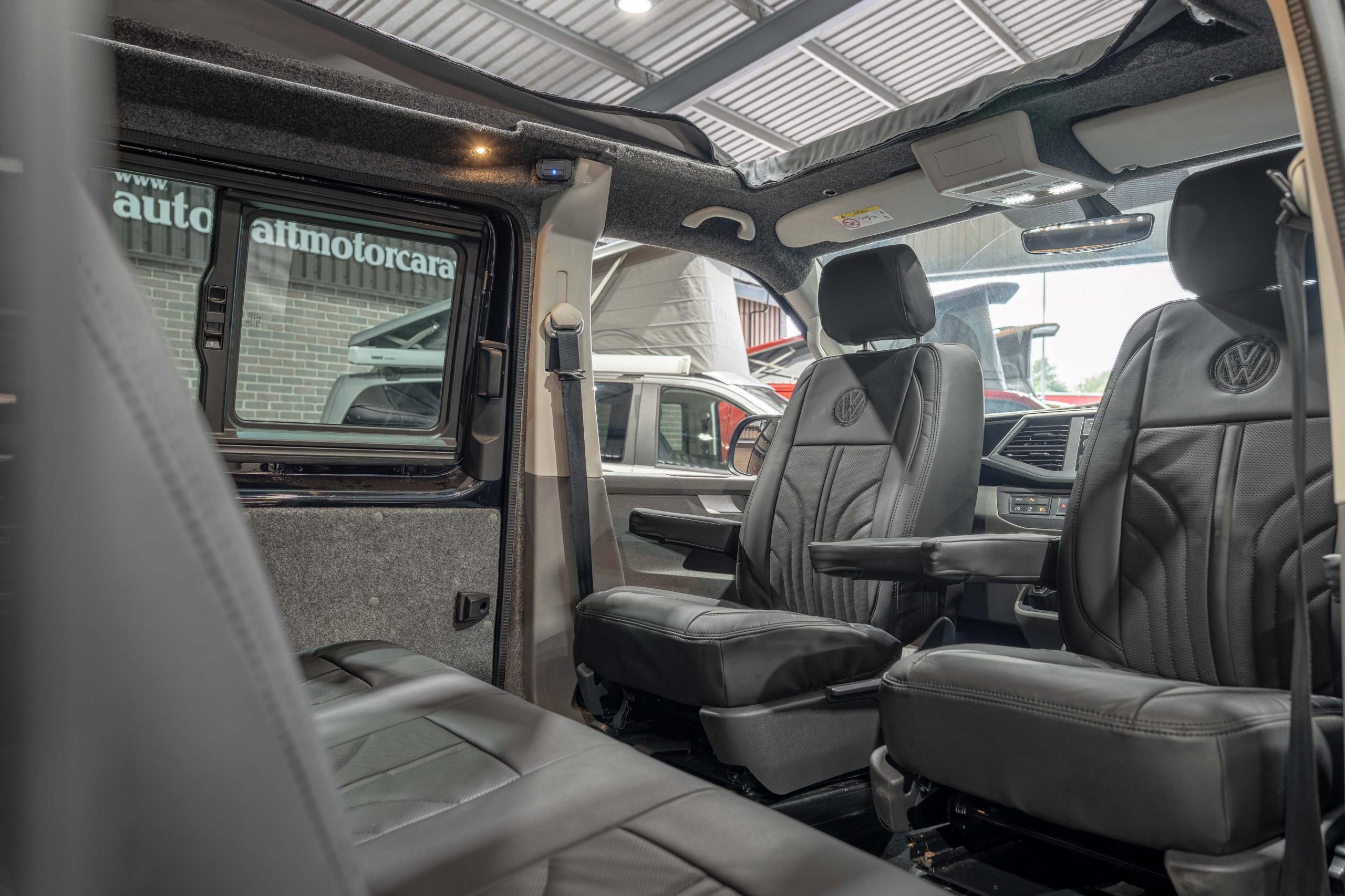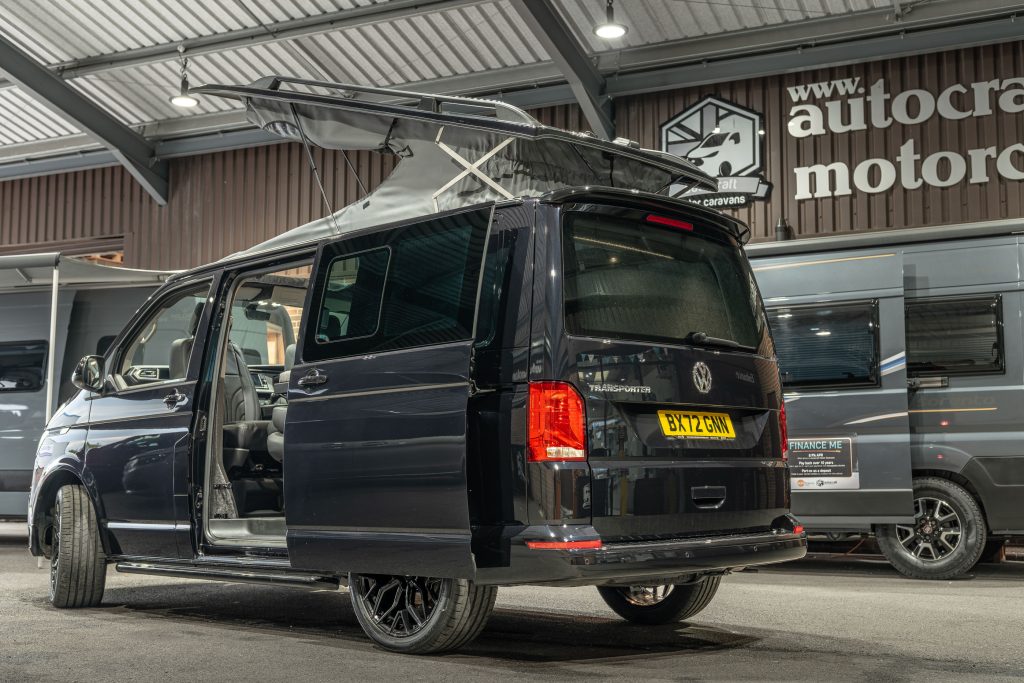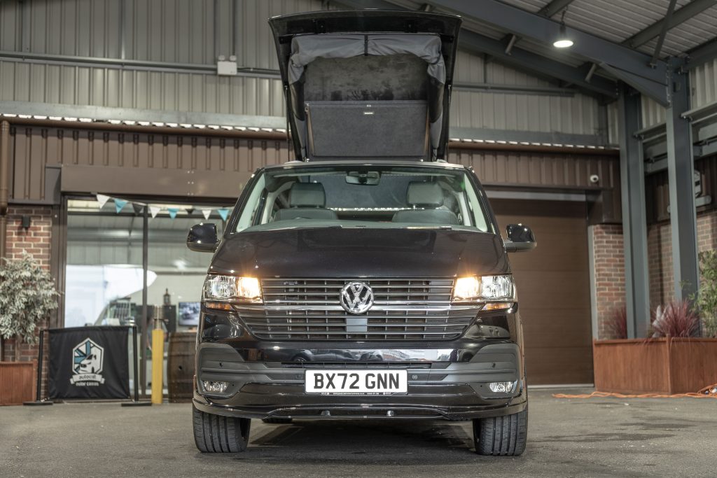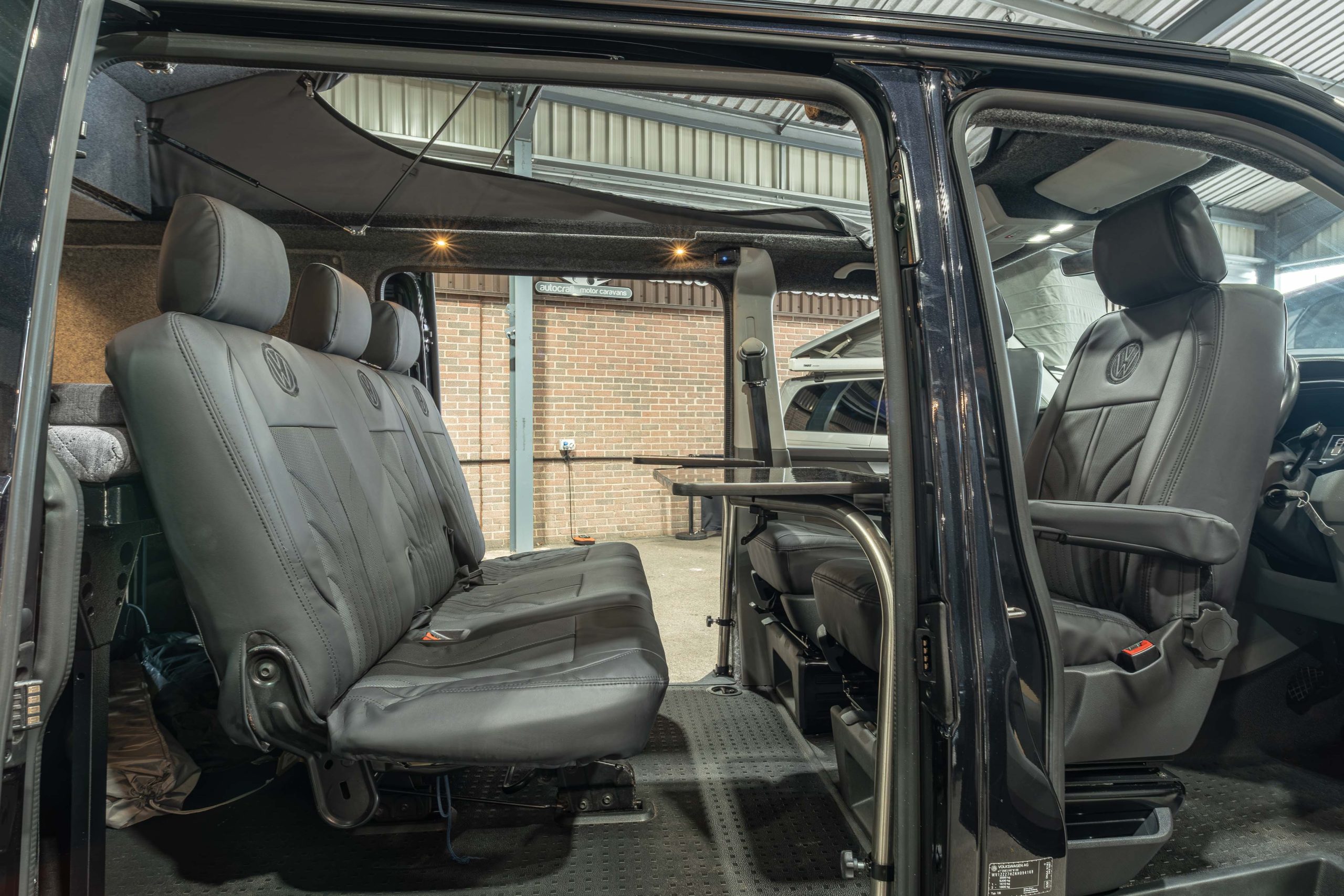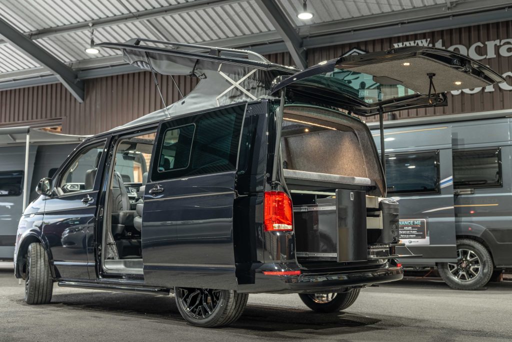 Just arrived into stock is this clever 2022 VW Transporter Kombi Conversion combining comfort, functionality and style all in one. Finished in stunning black, this Kombi features 5 belted seats (2 singles at the front with a 3 seater bench set up in the rear) a slide out bed in the rear with storage underneath, a pop-up roof with elevating bed for two and a slideout kitchen/storage pod at the rear.
