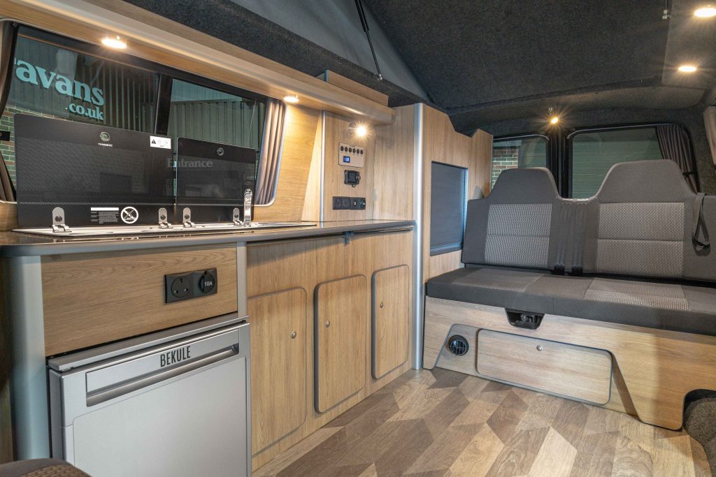Just arrived into stock is this stunning 2022 Metallic Black VW Transporter T6.1 Campervan. This camper has been professionally converted with light oak style cabinets and contrasting black sparkle worktop and table. Up front is a double passenger seat on a swivel base, with the rear rock n roll bed upholstered to match the original VW fabric.