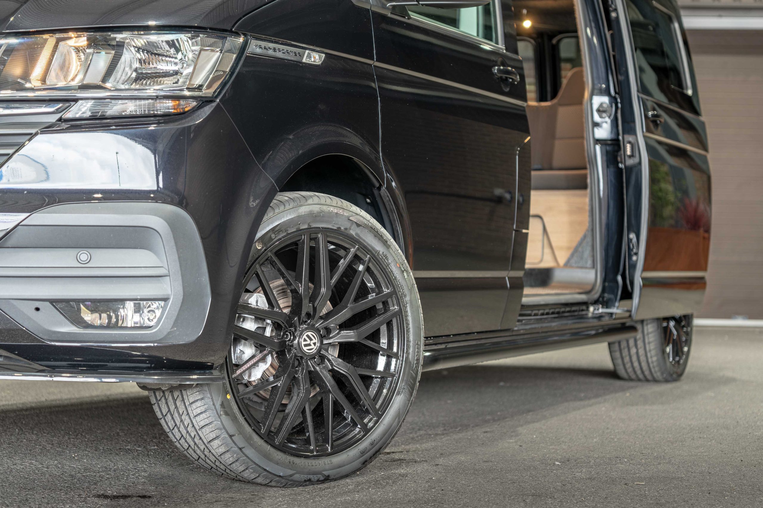 This camper has a set of gloss black 20” alloy wheels, black lower side bars and a front lower splitter to complete the look.