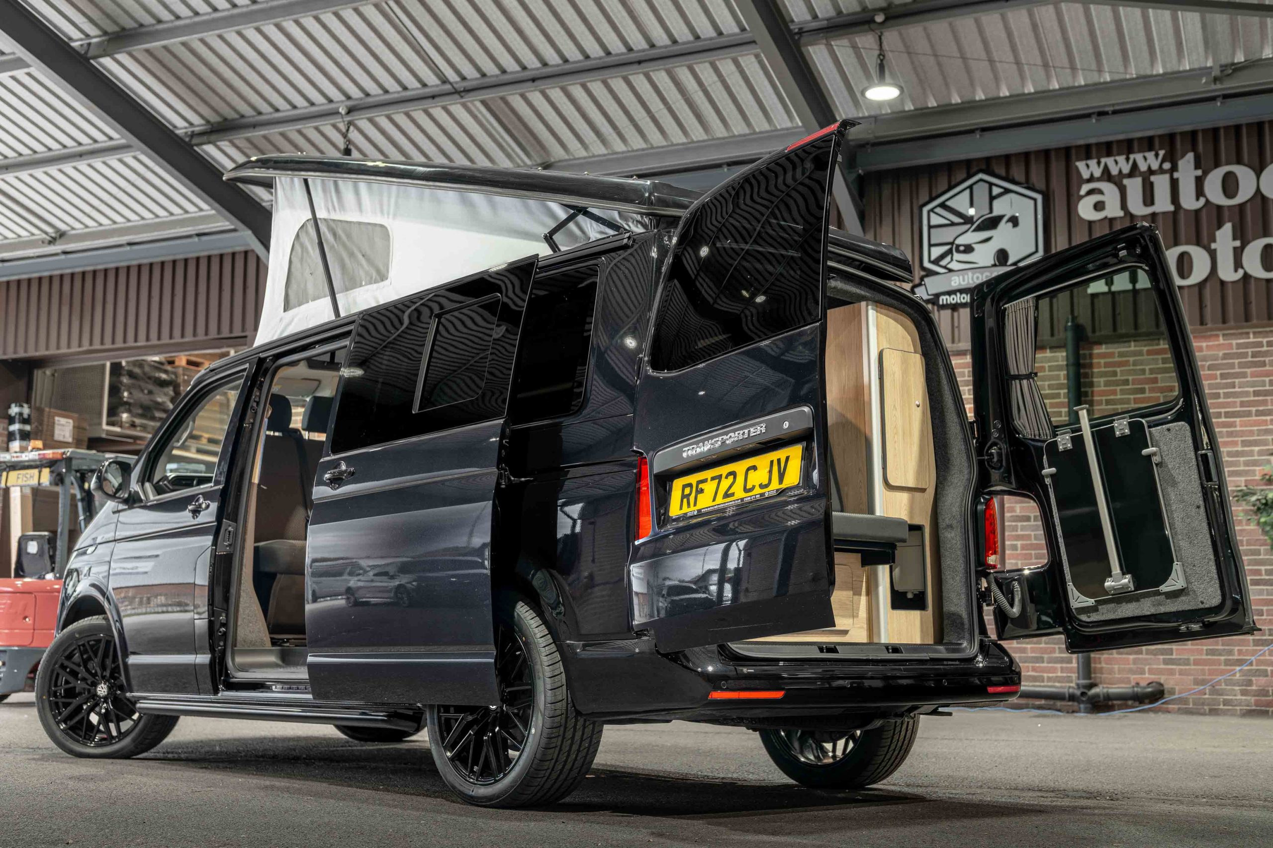 Just arrived into stock is this stunning 2022 Metallic Black VW Transporter T6.1 Campervan. This camper has been professionally converted with light oak style cabinets and contrasting black sparkle worktop and table. Up front is a double passenger seat on a swivel base, with the rear rock n roll bed upholstered to match the original VW fabric.